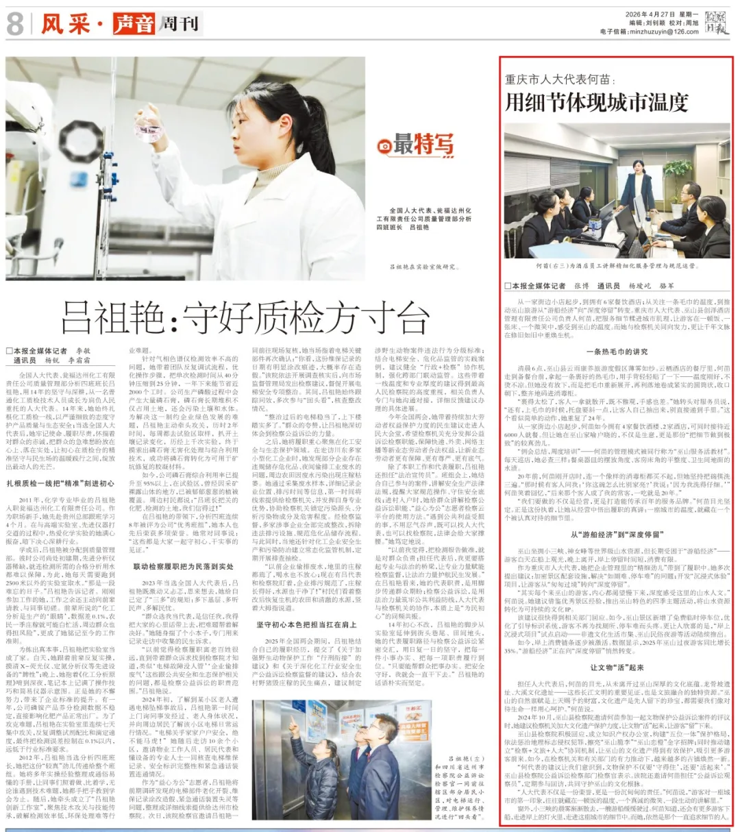 2026年4月27日,《28圈日报 》第8版刊登《重庆市人大代表何苗:用细节体现城市温度》一文,内容如下: