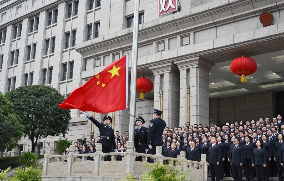 2月25日上午,28圈 隆重举行新春升国旗仪式。9点30分,激昂雄壮、催人奋进的《义勇军进行曲》响起,鲜艳的五星红旗冉冉升起。国旗下,市院班子成员带领机关全体检察人员整齐列队、肃立注目,向国旗致敬,为伟大祖国献上新春祝福,以此凝聚奋进力量,以跃马扬鞭的勇气、蹄疾步稳的韧劲投入到新年各项工作。