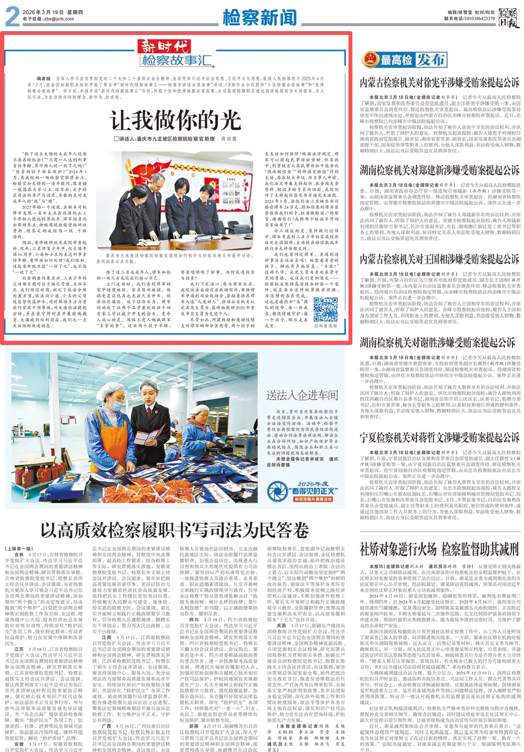 2026年3月19日,《检察日报》第2版“新时代检察故事汇”专栏刊登《让我做你的光》一文,内容如下: