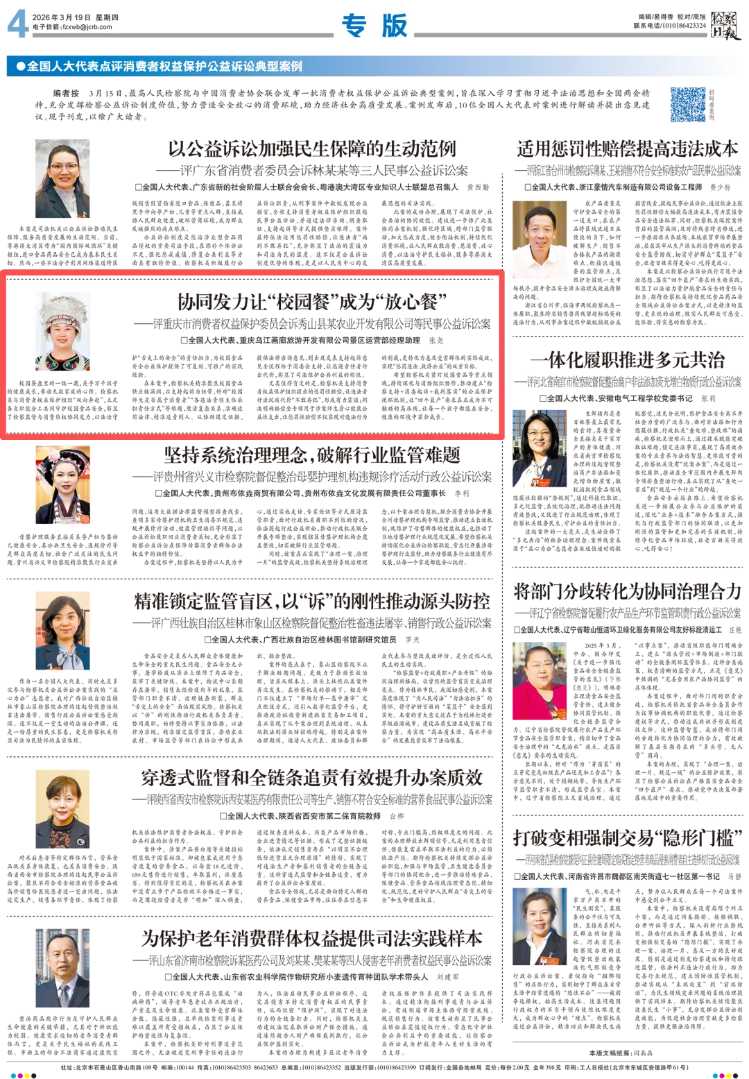 2026年3月19日,《28圈日报 》第4版刊登《协同发力让“校园餐”成为“放心餐”——评重庆市消费者权益保护委员会诉秀山县某农业开发有限公司等民事公益诉讼案》一文,内容如下: