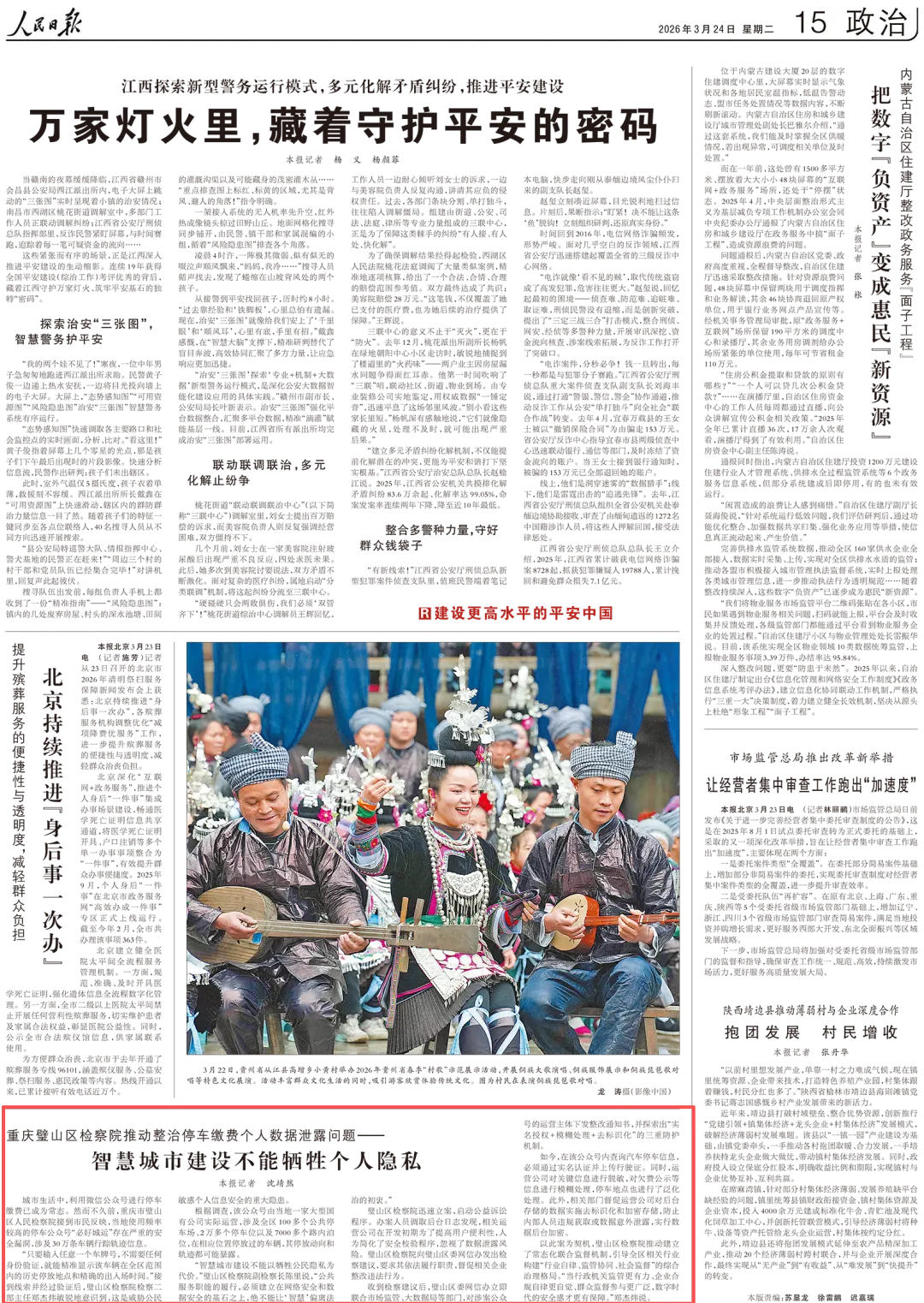 2026年3月24日,《人民日报》第15版刊登《重庆璧山区检察院推动整治停车缴费个人数据泄露问题——智慧城市建设不能牺牲个人隐私》一文,内容如下: