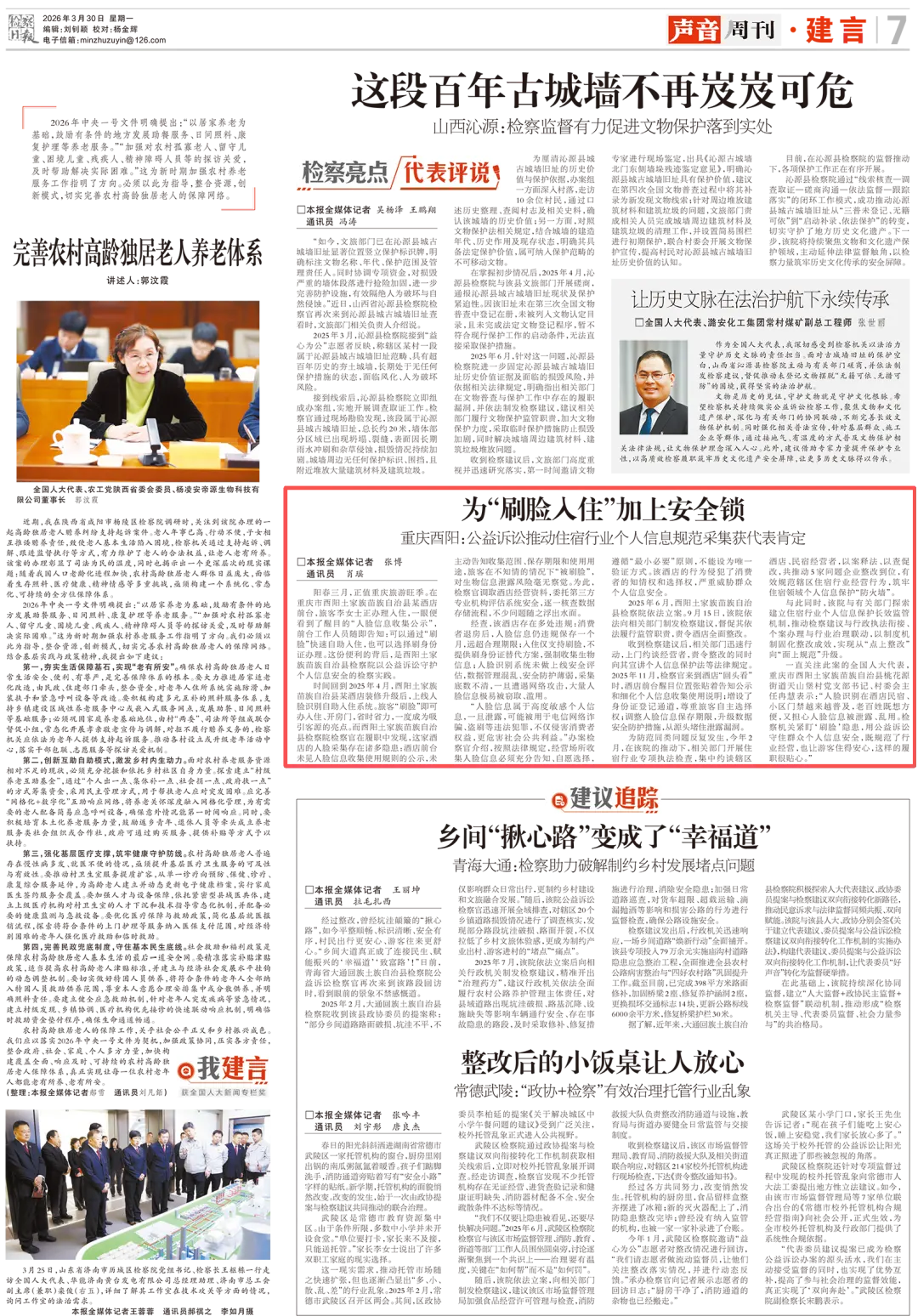 2026年3月30日,《28圈日报 》第7版刊登《为“刷脸入住”加上安全锁——重庆酉阳:公益诉讼推动住宿行业个人信息规范采集获代表肯定》一文,内容如下: