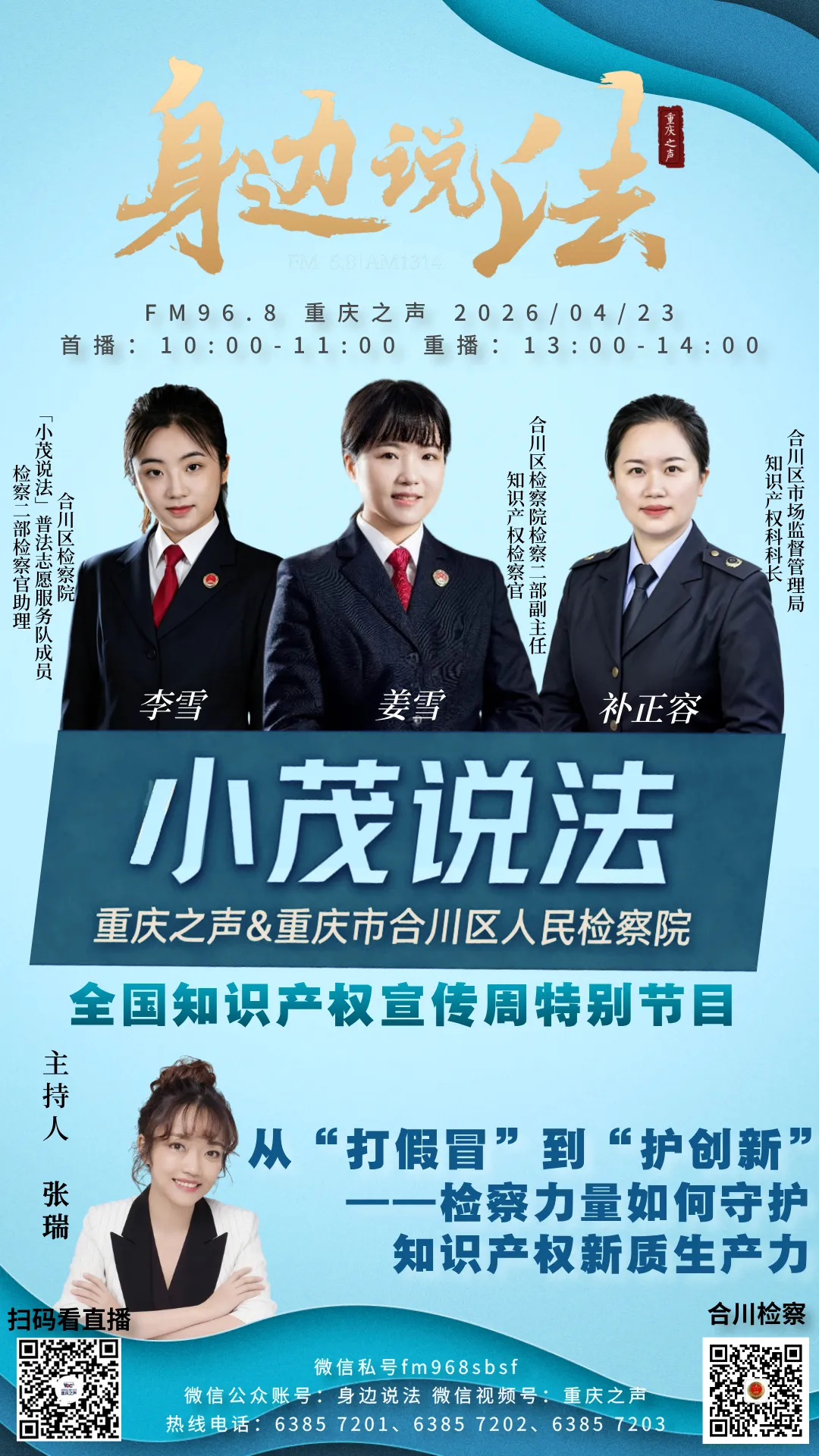 4月23日,《重庆之声·身边说法》栏目邀请合川区检察院检察二部副主任、知识产权检察官姜雪,“小茂说法”普法志愿服务队成员李雪,携手合川区市场监督管理局知识产权科科长补正容,通过两个真实案例,讲述了检察机关如何“打假冒、护创新”,并为企业、消费者和创作者送上实用的“避坑指南”。