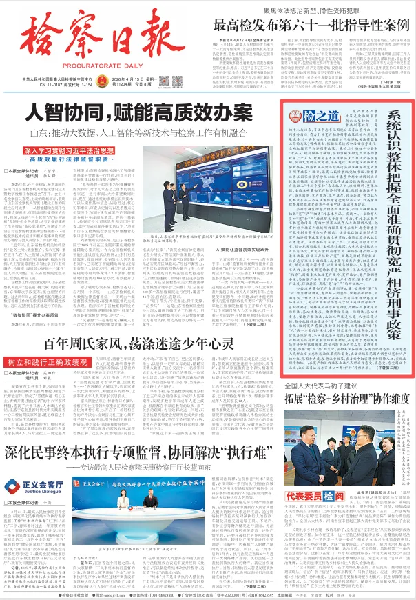 “宽以济猛,猛以济宽,政是以和。”全面准确贯彻宽严相济刑事政策事关国家长治久安、人民安居乐业。各级检察机关要深刻认识宽严相济刑事政策的重要作用,准确把握内涵要求,始终坚持以习近平法治思想为根本遵循,全力履行国家法律监督机关职责,推动宽严相济刑事政策得到全面准确贯彻,更好运用法治力量支撑和服务中国式现代化。